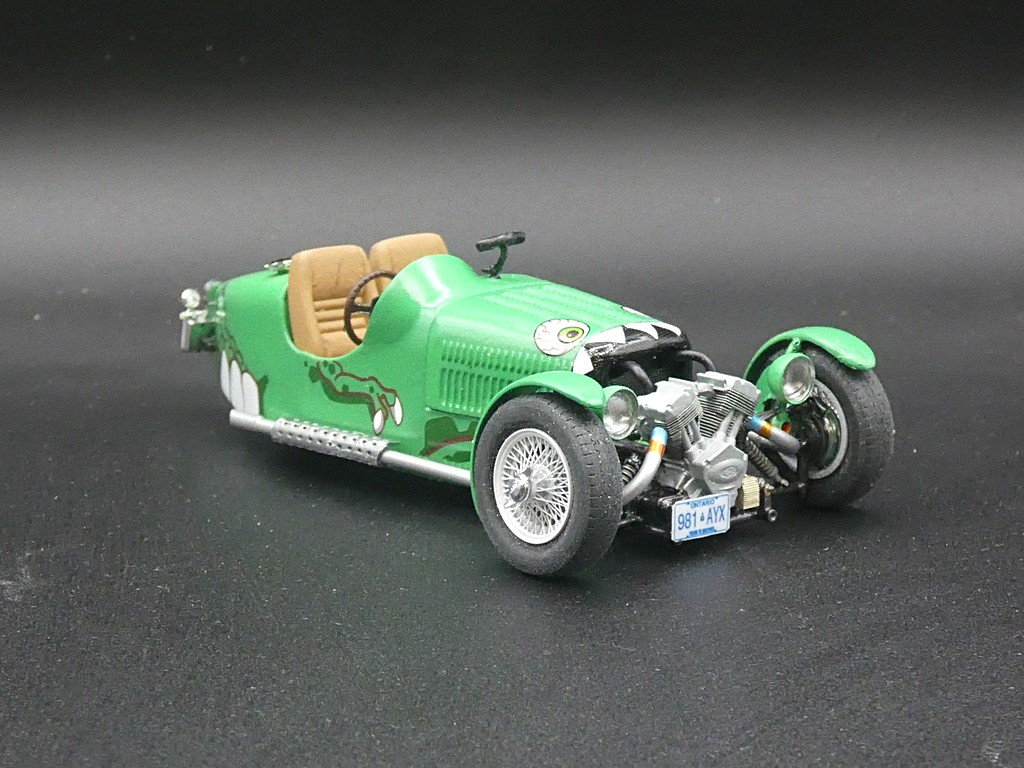 "Trike-A-Saurus" 3D printed Morgan engine from Iceman Collections, Monogram Bugatti body, decals from "Rexy", other items from parts box